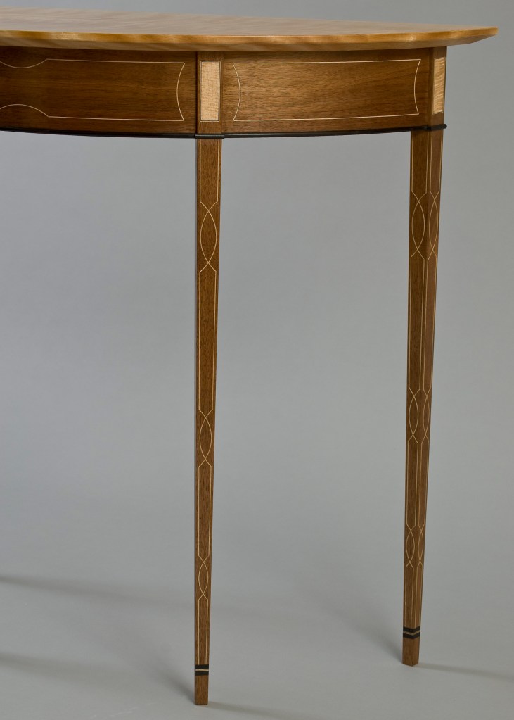 Curly Birch Top, Black Walnut Base, Ebony Cock Bead and Cuff, Sycamore String Inlay, L 32″ H 29″ W 14″